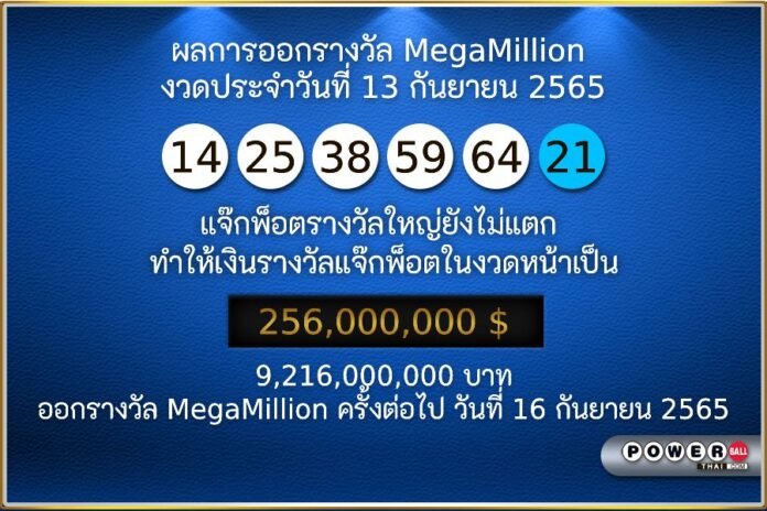 ผลการออกรางวัล MEGAMILLION ประจำงวดวันที่ 13 กันยายน 2565