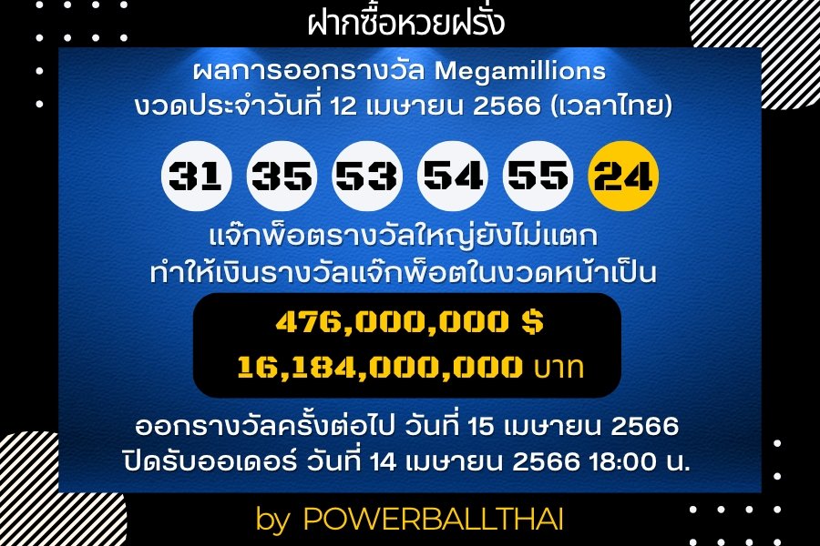 ผลการออกรางวัล MEGAMILLIONS ประจำงวดวันที่ 12 เมษายน 2566