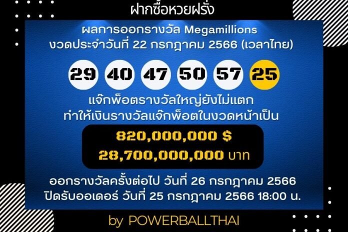 จะทำการออกรางวัล MEGAMILLIONS ครั้งต่อไปในวันที่ 26 กรกฎาคม 2566