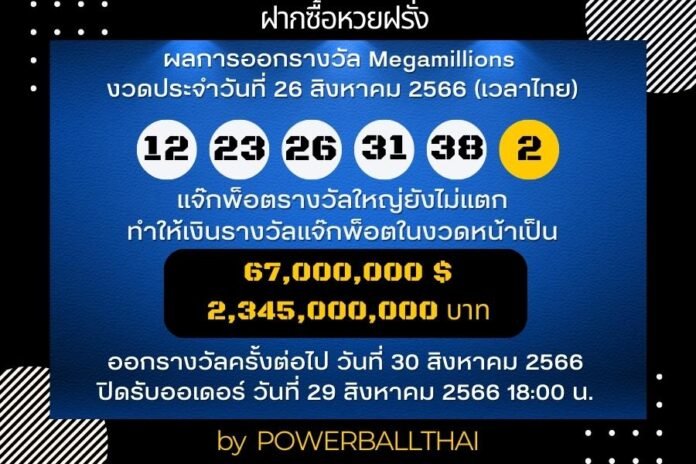 จะทำการออกรางวัล MEGAMILLIONS ครั้งต่อไปในวันที่ 30 สิงหาคม 2566