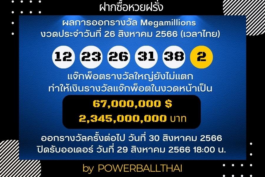 ผลการออกรางวัล MEGAMILLIONS ประจำงวดวันที่ 26 สิงหาคม 2566