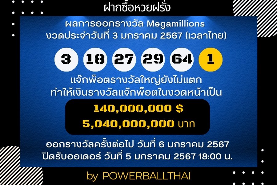 ผลการออกรางวัล MEGAMILLIONS ประจำงวดวันที่ 3 มกราคม 2567