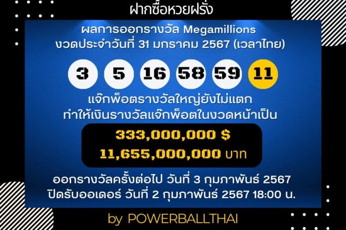 ผลการออกรางวัล MEGAMILLIONS ประจำงวดวันที่ 31 มกราคม 2567
