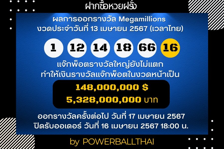 ผลการออกรางวัล MEGAMILLIONS ประจำงวดวันที่ 13 เมษายน 2567