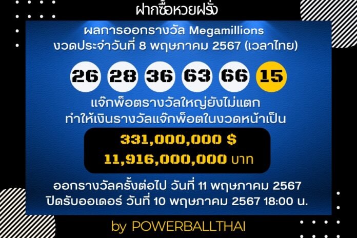 ผลการออกรางวัล MEGAMILLIONS ประจำงวดวันที่ 8 พฤษภาคม 2567