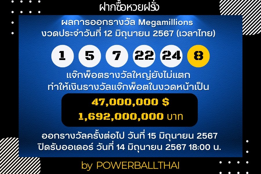 ผลการออกรางวัล MEGAMILLIONS ประจำงวดวันที่ 12 มิถุนายน 2567