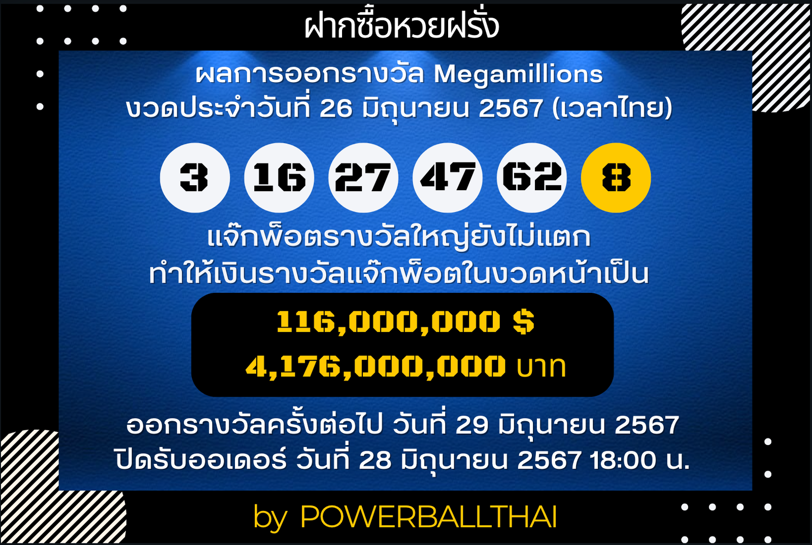 ผลการออกรางวัล Megamillions งวดประจำวันที่ 26 มิถุนายน 2567 ตามเวลาประเทศไทย #powerball #megamillions #ฝากซื้อหวยฝรั่ง #หวยฝรั่ง #หวยนอก #playforrich #กองสลากอินเตอร์ pic.twitter.com/zlWjZGxkVH