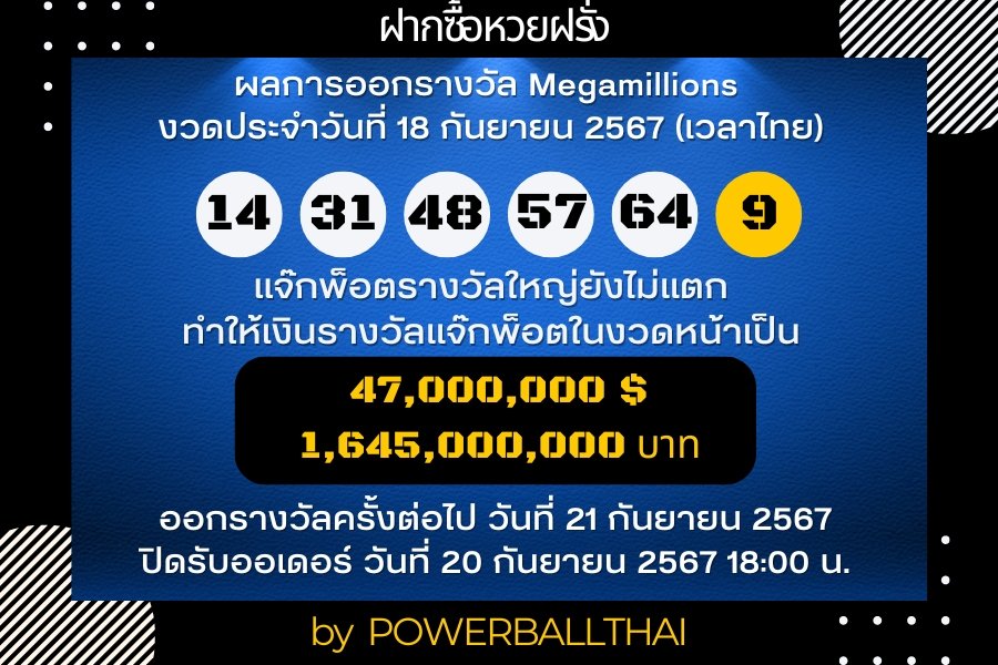 ผลการออกรางวัล Megamillions งวดประจำวันที่ 18 กันยายน 2567 ตามเวลาประเทศไทย #powerball #megamillions #ฝากซื้อหวยฝรั่ง #หวยฝรั่ง #หวยนอก #playforrich #กองสลากอินเตอร์ pic.twitter.com/aXLe88N4iM