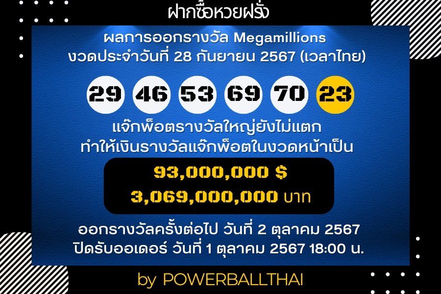 ผลการออกรางวัล Megamillions งวดประจำวันที่ 28 กันยายน 2567 ตามเวลาประเทศไทย #powerball #megamillions #ฝากซื้อหวยฝรั่ง #หวยฝรั่ง #หวยนอก #playforrich #กองสลากอินเตอร์ pic.twitter.com/yIEmwAeepu