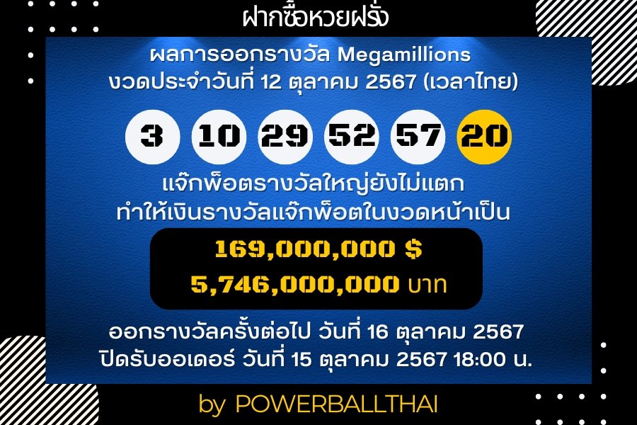 ผลการออกรางวัล Megamillions งวดประจำวันที่ 12 ตุลาคม 2567 ตามเวลาประเทศไทย #powerball #megamillions #ฝากซื้อหวยฝรั่ง #หวยฝรั่ง #หวยนอก #playforrich #กองสลากอินเตอร์ pic.twitter.com/6zYMVrehsf