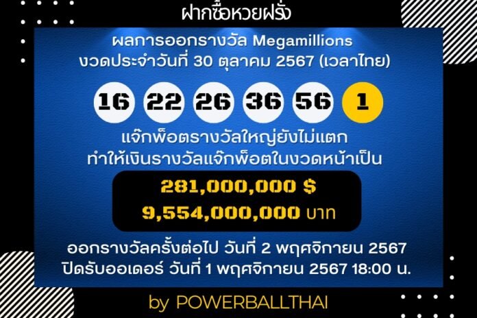 ผลการออกรางวัล MEGAMILLIONS ประจำงวดวันที่ 30 ตุลาคม 2567