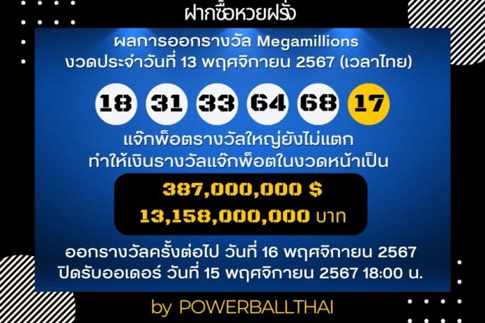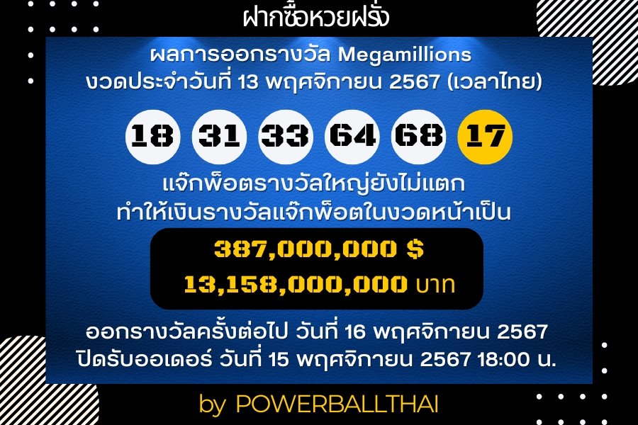 ผลการออกรางวัล MEGAMILLIONS ประจำงวดวันที่ 13 พฤศจิกายน 2567