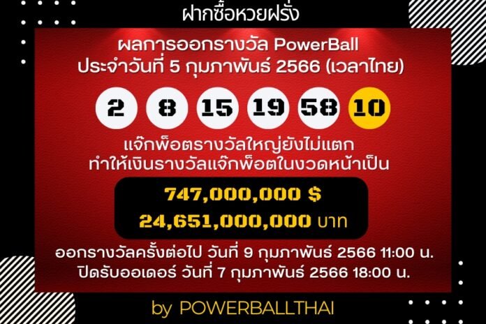 จะทำการออกรางวัล POWERBALL ครั้งต่อไปในวันที่ 9 กุมภาพันธ์ 2566