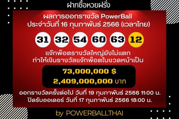 ผลการออกรางวัล POWERBALL ประจำงวดวันที่ 16 กุมภาพันธ์ 2566