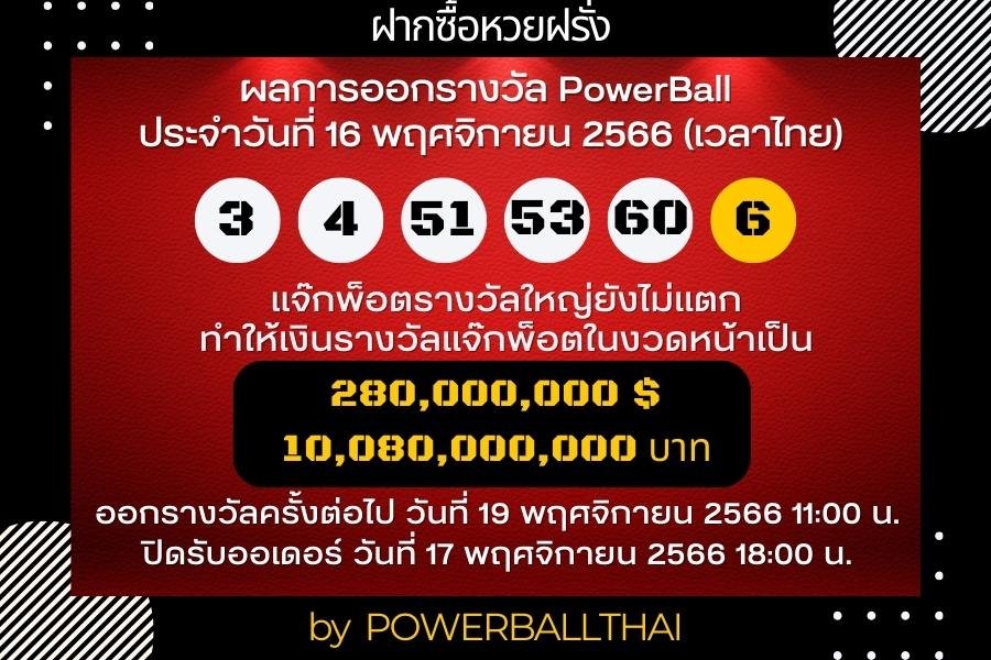ผลการออกรางวัล POWERBALL ประจำงวดวันที่ 16 พฤศจิกายน 2566