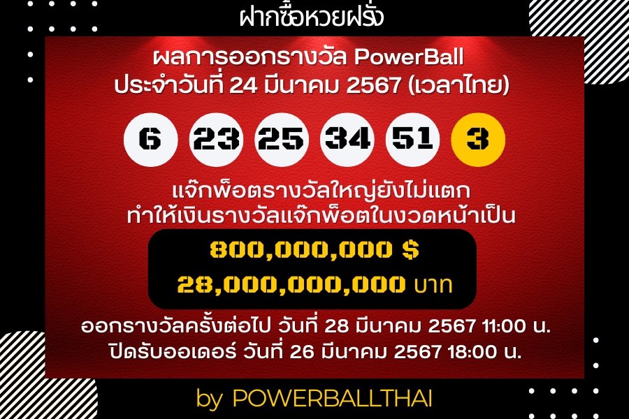 ผลการออกรางวัล Powerball งวดประจำวันที่ 24 มีนาคม 2567 ตามเวลาประเทศไทย #powerball #megamillions #ฝากซื้อหวยฝรั่ง #หวยฝรั่ง #หวยนอก #playforrich #กองสลากอินเตอร์ pic.twitter.com/UTREH6eEzk