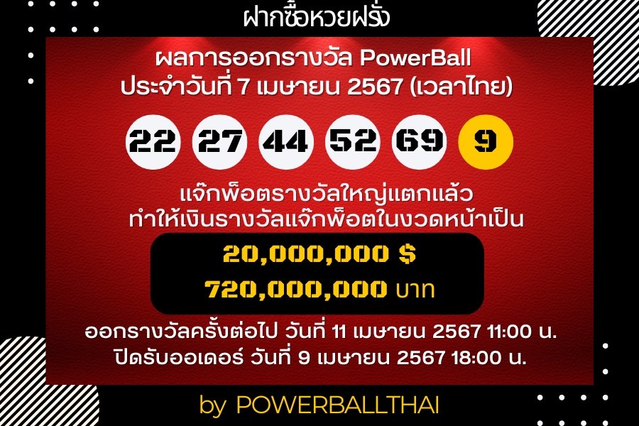ผลการออกรางวัล POWERBALL ประจำงวดวันที่ 7 เมษายน 2567