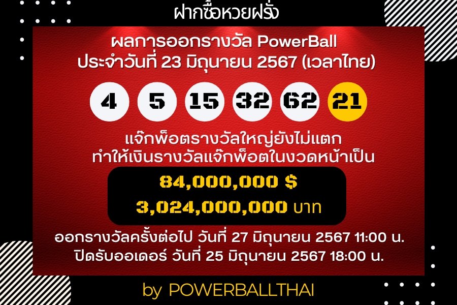 ผลการออกรางวัล POWERBALL ประจำงวดวันที่ 23 มิถุนายน 2567