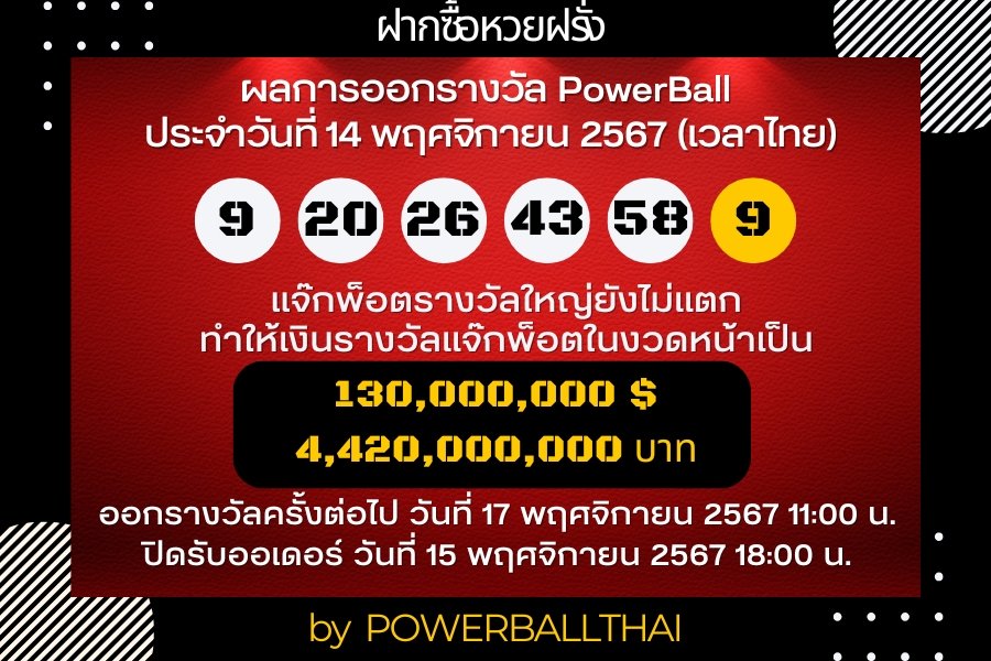 ผลการออกรางวัล POWERBALL ประจำงวดวันที่ 14 พฤศจิกายน 2567
