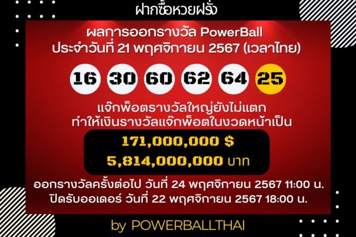 ผลการออกรางวัล POWERBALL ประจำงวดวันที่ 21 พฤศจิกายน 2567