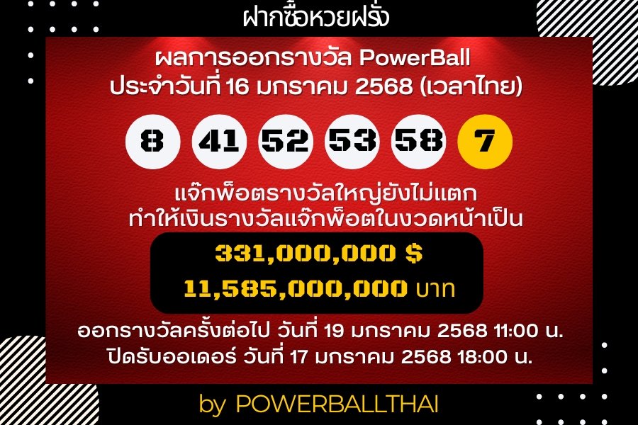 ผลการออกรางวัล POWERBALL ประจำงวดวันที่ 16 มกราคม 2568